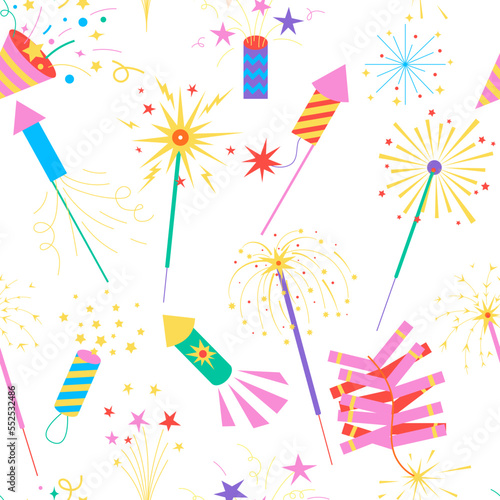 Seamless pattern with bright abstract fireworks, firecrackers and sparklers. Hand drawn vector illustration. Party lights background.