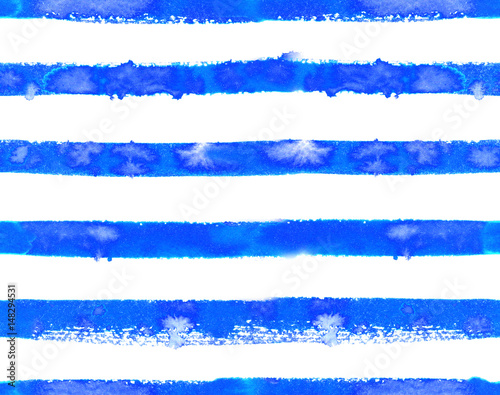 Seamless pattern with bright blue horizontal stripes painted in watercolor on white isolated background