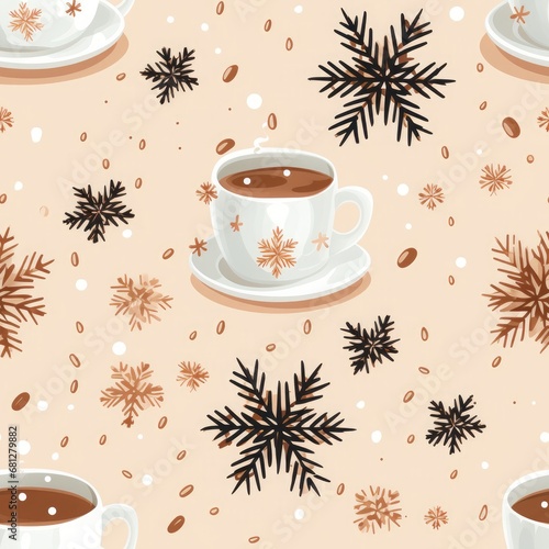 Seamless pattern with cups of coffee and snowflakes. Vector illustration.
