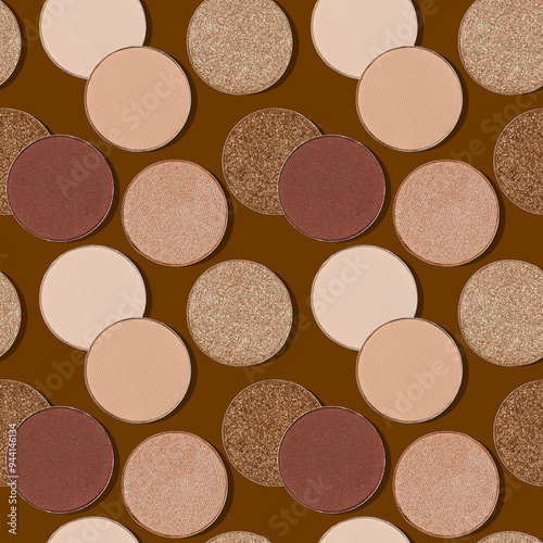 Seamless pattern with eye shadow swatches, beige brown tints, on chocolate color background. Round eyeshadows powder for makeup, cosmetics design minimal print, top view autumn mood beauty