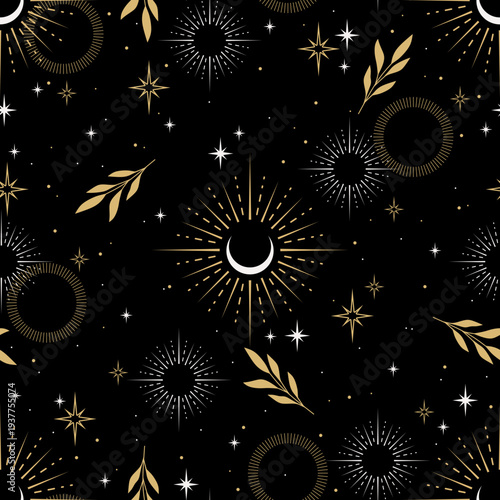 Seamless pattern with moon and stars. Mystical esoteric background for design of fabric, packaging, astrology, phone case, wrapping paper.