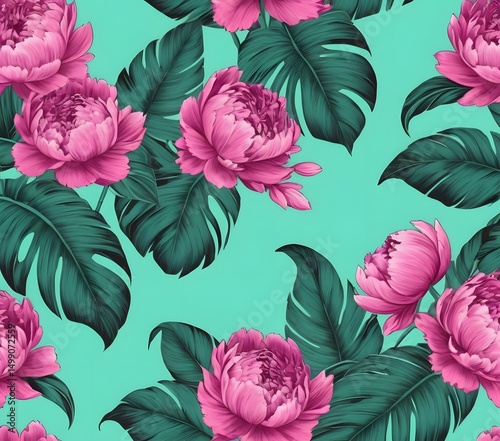 Seamless Pattern with Peonies and Banana Leaves. Perfect for textile design, wrapping paper, and tropical-themed decor.