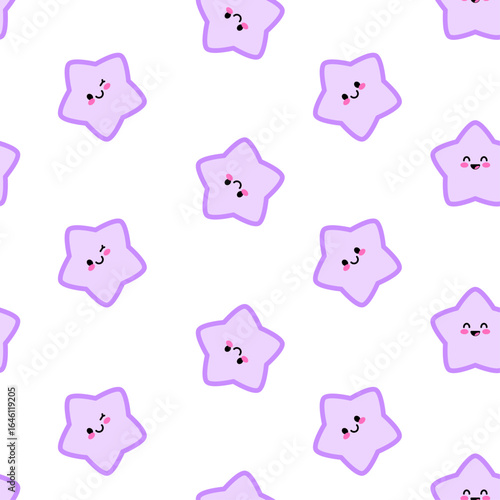 Seamless pattern with purple kawaii stars with happy face, funny emotion, smile. Good night children's, nursery vector illustration pajamas print.