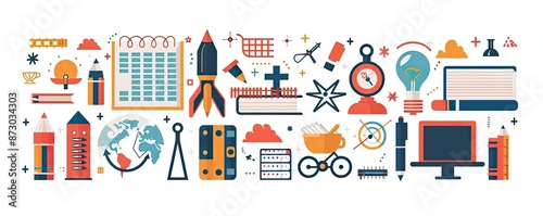 Seamless pattern with various education-related icons such as books, rocket, earth globe, and lab equipment in flat style, perfect for school projects.