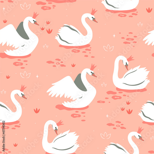 Seamless pattern with white crowned swans on a pond. Vector graphics.