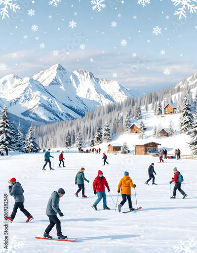 Seamless pattern with Winter Alps holidays background with active people. Winter outdoor activities, People ice skating, skiing, snowboarding, sledding, professional photography