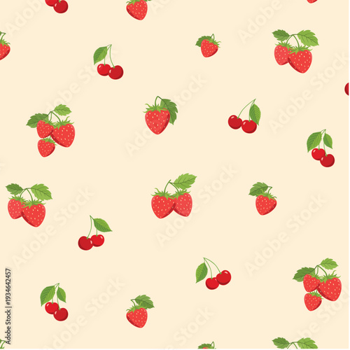 Seamless Strawberry and Cherry Pattern on Cream Background, Summer Berry Fruit Vector for Textile and Gift Wrap Design