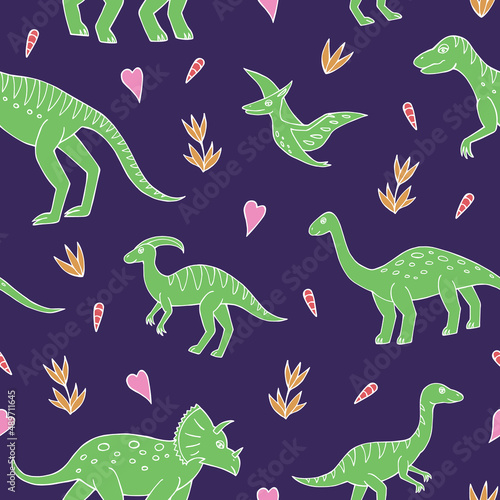 Seamless vector pattern with sketch of dinosaurs and abstract floral. Decoration print for wrapping, wallpaper, fabric. Seamless vector texture.