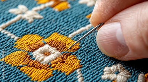 Seamstress s Hand Holding Needle and Thread Preparing to Sew Intricate Textile