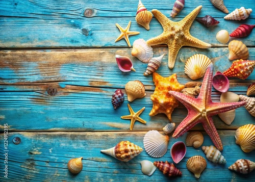 Seashells & Starfish on Blue Wood: Summer Beach Theme Stock Photo with Copy Space