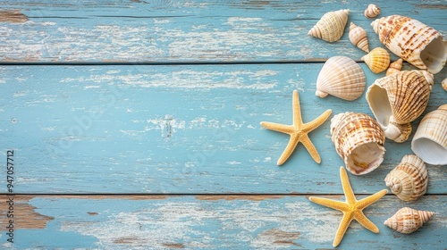 Seashells and starfish on beach-themed wooden background. Perfect for summer, vacation, and coastal themed concepts.