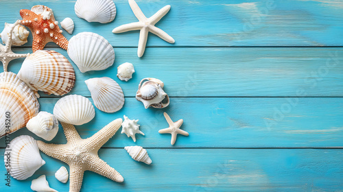 Seashells and starfish on blue wooden surface evoke summer vibes