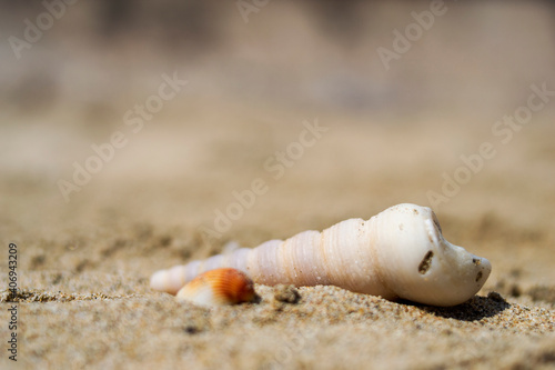 Seashells on the sand close-up. Tropical beach. Summer background. Copy space