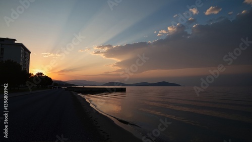 Seaside Urban Dawn in Albania Durres, vibrant sky with orange and yellow hues over calm ocean. Concept of Seaside Urban Dawn in Albania Durres, tranquil landscape reflecting nature's beauty.