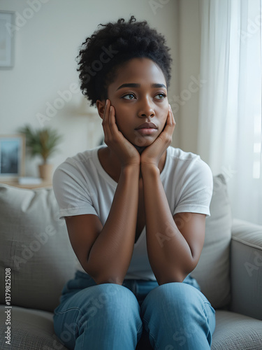 Seasonal Depression. Upset Young Black Woman Sitting On sofa At Home And Looking Aside, Sad Pensive African American Female Suffering Life Problems Or Mental Breakdown, Feeling Lonely, Copy Space