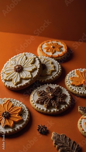 Seasonal-Themed Decorated Cookies Arranged on Orange Background