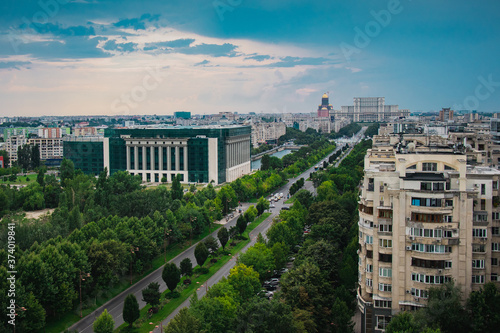 Seat of Romanian parliament, huge building in the centre of Bucharest, Romania on a cloudy summer day. View over the avenue looking towards parliament