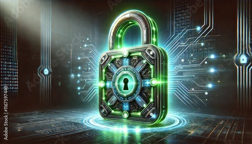 Secure Internet Connection Symbolized by a Green Lock or Shield: High-Tech Realistic Design with Glowing Elements