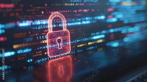 Secure software development code with padlock on computer screen, blurred background, copy space
