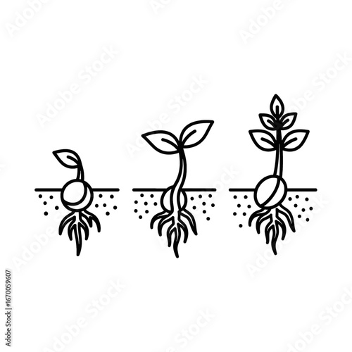 Seedling Growth Stages Depicted in Black and White Line Art Illustration with Roots in Soil and Leaves Sprouting