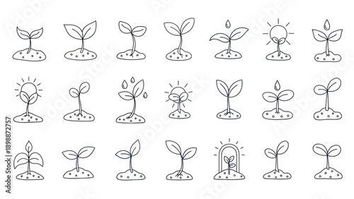 Seedling Growth Stages: Dotted Line Icons for Sprout Development and New Life