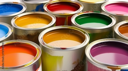 Selection of open paint cans on vivid background showcasing an array of different colors
