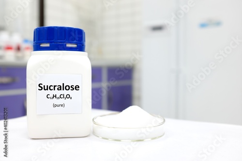 Selective focus of a bottle of pure sucralose artificial sweetener sugar substitute. White laboratory background with copy space.