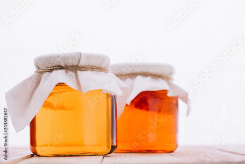 selective focus of bottled natural kombucha mushroom with tea in jars isolated on white