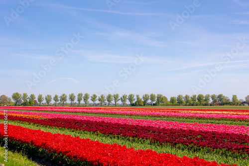 Selective focus of row or line multicolor tulip flowers on the field in countryside farm, Tulips are plants of the genus Tulipa, Spring-blooming perennial herbaceous bulbiferous geophytes, Netherlands