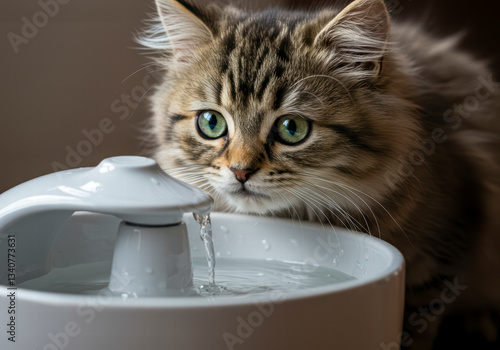 Selective focus on a cute kitten enjoying water at a pet drinking fountain in a home environment