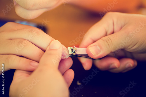 Selective focus to woman cutting nails to a hygiene child. Female hands hold nail scissors and child's hand. Manicure for kid by hand of scissor to cut nail for clean.