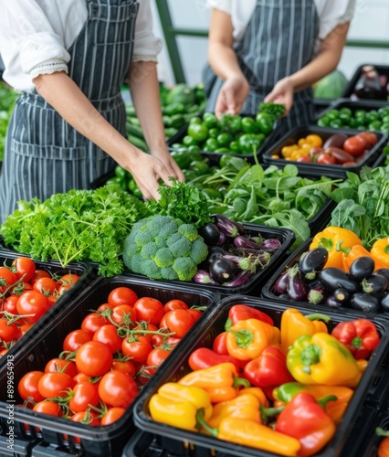 Sellers are laying out fresh vegetables and greens at the market