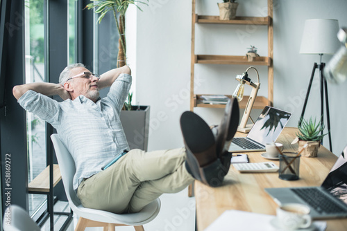 senior businessman sitting with his legs on table at office