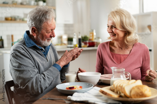 Senior couple eating breakfast in the kitchen. Husband and wife talking and laughing while eating a sandwich...
