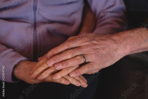 Senior couple holding hands at home