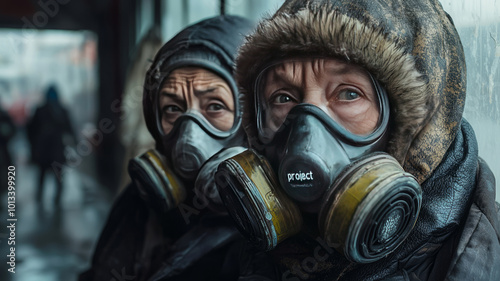 Senior couple wearing gasmask in the bright white livingroom, looking out of the window, a new virus that will infect humanity