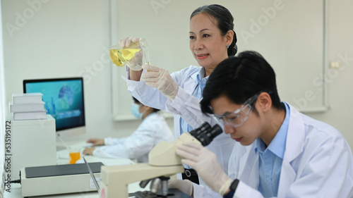 Senior female scientist in white coat examining samples and liquid in laboratory. Medicine and science researching concepts