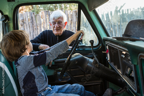 senior grandfather and his 6 year old grandson in vintage pick up truck