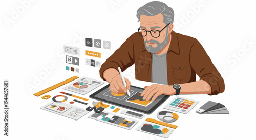 Senior Graphic Designer Working on a Tablet Creating UI/UX Layouts and Digital Content.