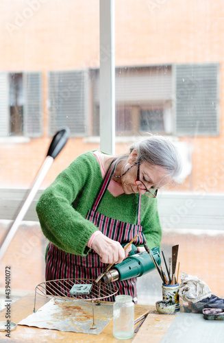 Senior grey-haired woman working on a small bronze sculpture in her bright artisan studio