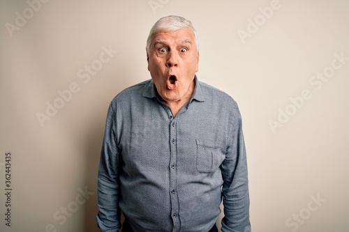 Senior handsome hoary man wearing casual shirt standing over isolated white background afraid and shocked with surprise expression, fear and excited face.
