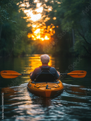 Senior man kayaking on calm river at sunset, surrounded by lush greenery, feels peaceful