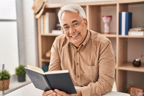 Senior man reading book sitting on table at home
