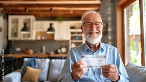 Senior man smiling joyfully as he receives a retirement payment check in a cozy living room, celebrating financial security and peaceful home life.