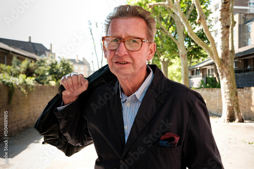 Senior man walking down the street carrying bag over shoulder