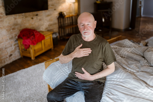 Senior man with eyes closed doing breathing exercise while sitting on bed at home