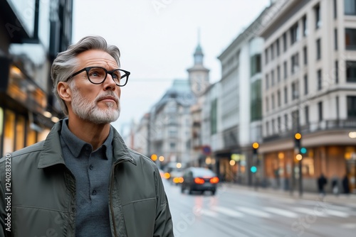 Senior man with gray hair and glasses walking in an urban area on a cloudy day. Concept of wisdom, modern aging, and outdoor lifestyle.