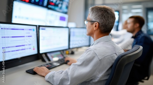 Senior man working at computer with multiple screens in office