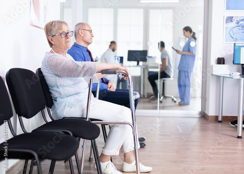 Senior woman with walking frame in hospital waiting room for rehabilitation treatment. Medical staff discussing about patient x-ray.