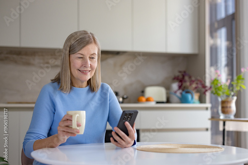 Senior woman with white hair smiling at a kitchen table, holding a ceramic mug and using a smartphone to browse messages and connect with friends and family in natural morning light